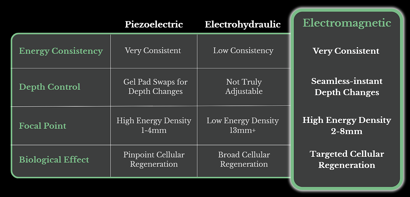 Precision Pulse FX delivers consistent energy and seamless real-time depth control. Electromagnetic tech outperforming the variability of electrohydraulic and the limitations of piezoelectric systems. Focused electromagnetic technology provides consistent energy delivery at depth, designed for precise, high-intensity focal zones.